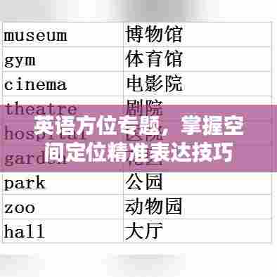 在我们的日常生活中,方位和空间的认知对于导航、交流以及进行各种活动时至关重要,随着全球化的进程,英语作为一种国际语言,在表达方位方面扮演着重要角色,本文将围绕“英语方位专题”展开讨论,帮助读者更好地掌握空间定位的表达方式。